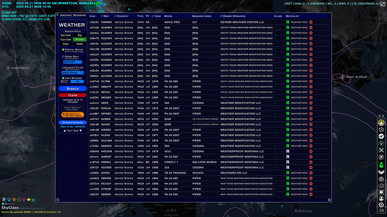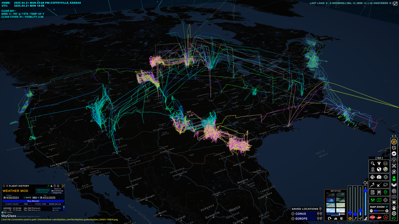 If this topic has stirred something in you—curiosity, concern, or a desire to verify what’s really happening above your region—SkyGlass Pro+ offers the most advanced aviation intelligence tools available. Included in this report are actual screenshots from SkyGlass showing flight traces of registered weather modification aircraft over the last 90 days, a task completed in just a few clicks within the SkyGlass platform.