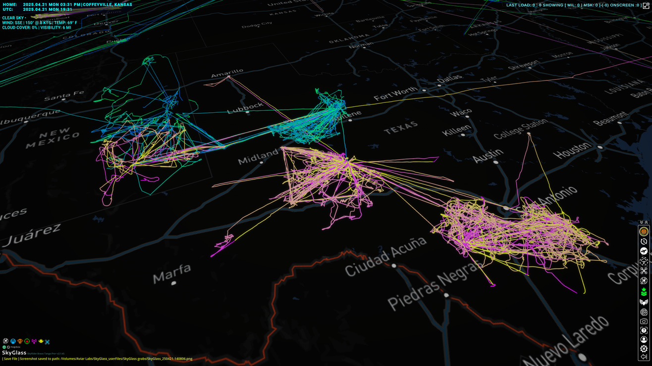 Image above: Flight activity from the past 12 months showing concentrated weather modification operations across Texas.