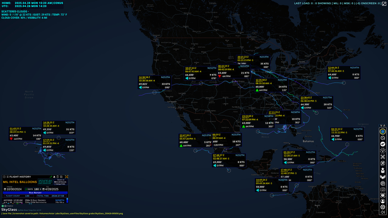 The image above shows the currently detected aerostat locations from the last 108 days. Although the operational ceiling is typically 15k feet, these aerostats often are reporting much higher from their onboard transponder.